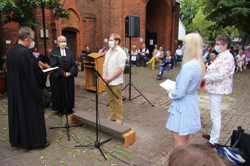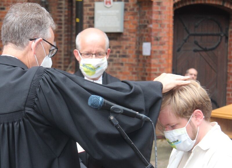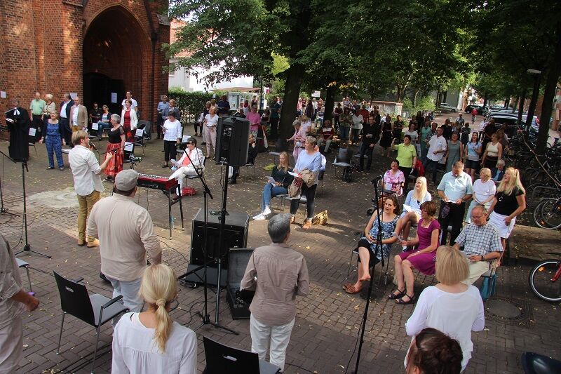 Die Freude war geradezu mit Händen greifbar: Es durfte wieder gesungen werden! Der Einladung zum Einführungsgottesdienst für Gospelkirchenkantor Jan Meyer als theologischer Referent der Landeskirche für Gospelmusik waren weit mehr als 100 Menschen gefolgt. Unter den Linden vor der Erlöserkirche nutzten sie die Gelegenheit, wieder einmal aus vollem Herzen mitzusingen, wenn auch in coronabedingtem Abstand.
